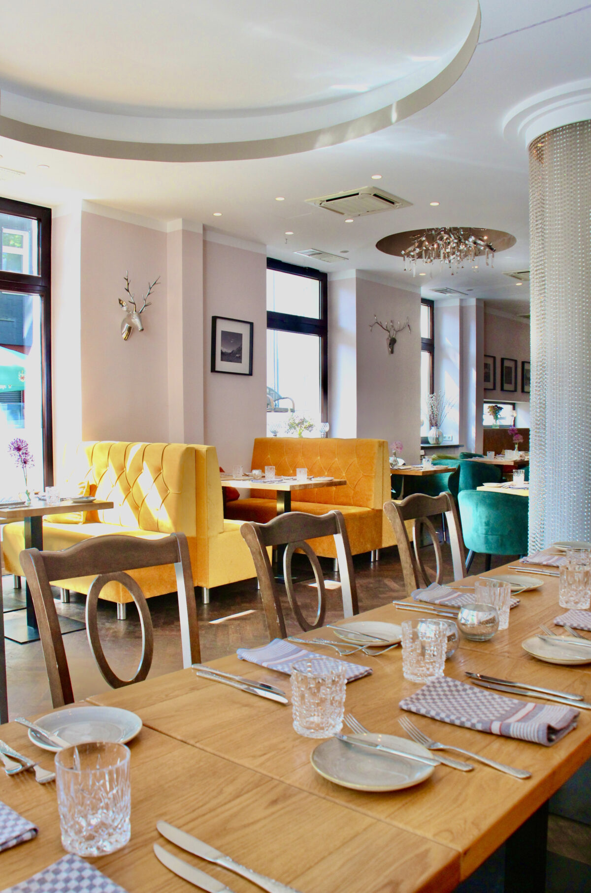 2019 haben Frank Schikfelder und Alicia Wolbeck das ehemalige Sterne-Restaurant „ Schote“ von Nelson Müller in die Alte Metzgerei verwandelt. Als einzige Erinnerung an das luxuriös eingerichtete Sternelokal wurden die beiden beleuchteten raumhohen Vorhänge aus Swarovski-Kristallen beibehalten.