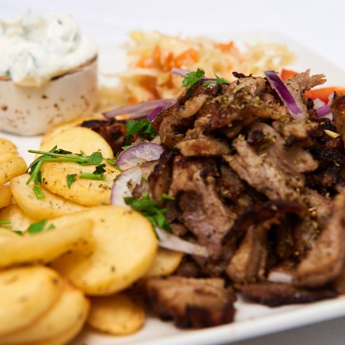 Die Küche bietet griechisches modernes Essen an und die integrierte Bar lädt Abends zu Cocktails ein.
